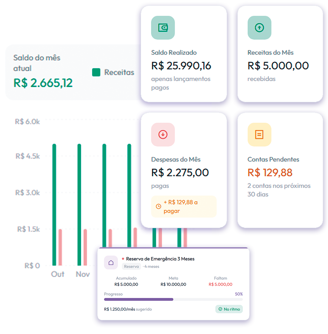 Centralize sua vida financeira, visualize seus resultados e tome decisões mais seguras com dados claros e atualizados em tempo real.